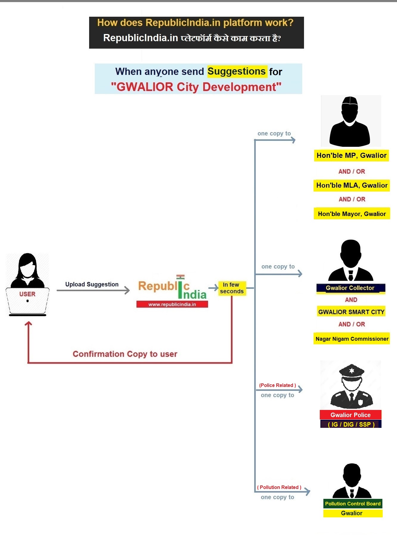 If you have any creative Idea / suggestion for Gwalior development, good governance, better Policies. Feel free to share your ideas / suggestions with Honorable Leaders of Gwalior City.